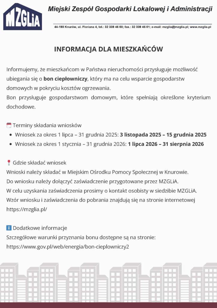W związku z wejściem w życie z dniem 30.09.2025 r. Ustawy o bonie ciepłowniczym oraz o zmianie niektórych ustaw w celu ograniczenia wysokości cen energii elektrycznej informujemy, że wsparcie przysługuje osobom korzystającym z ciepła systemowego (sieciowego), których koszt ogrzewania przekracza 170 zł/GJ netto tj.mieszkańcy poniższych adresów: