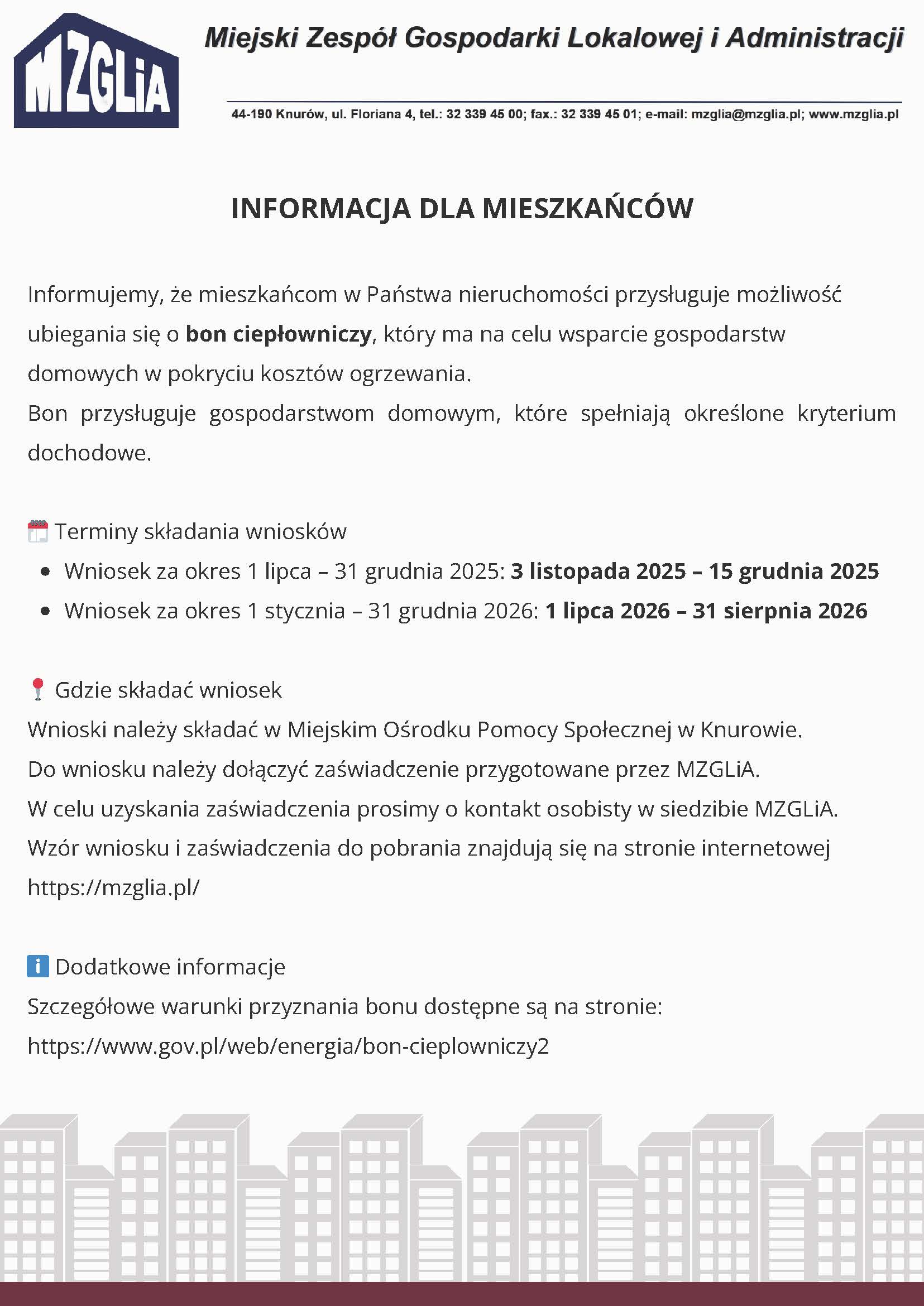 W związku z wejściem w życie z dniem 30.09.2025 r. Ustawy o bonie ciepłowniczym oraz o zmianie niektórych ustaw w celu ograniczenia wysokości cen energii elektrycznej informujemy, że wsparcie przysługuje osobom korzystającym z ciepła systemowego (sieciowego), których koszt ogrzewania przekracza 170 zł/GJ netto tj.mieszkańcy poniższych adresów: